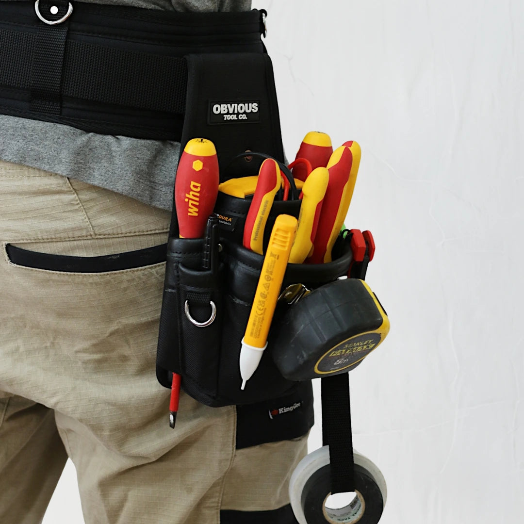 Just what I was after, I can carry my pliers, couple screwdrivers, marking pen, volt stick, meter, knife easily. With nice quick access. I do carry a tape measure on the outer clip, I would like to clip my drill to it but the position makes it a bit awkward to access when you are constantly clipping it off and on. Instead I purchased a small cordless screwdriver and that slips in the main pouch with my pliers.
