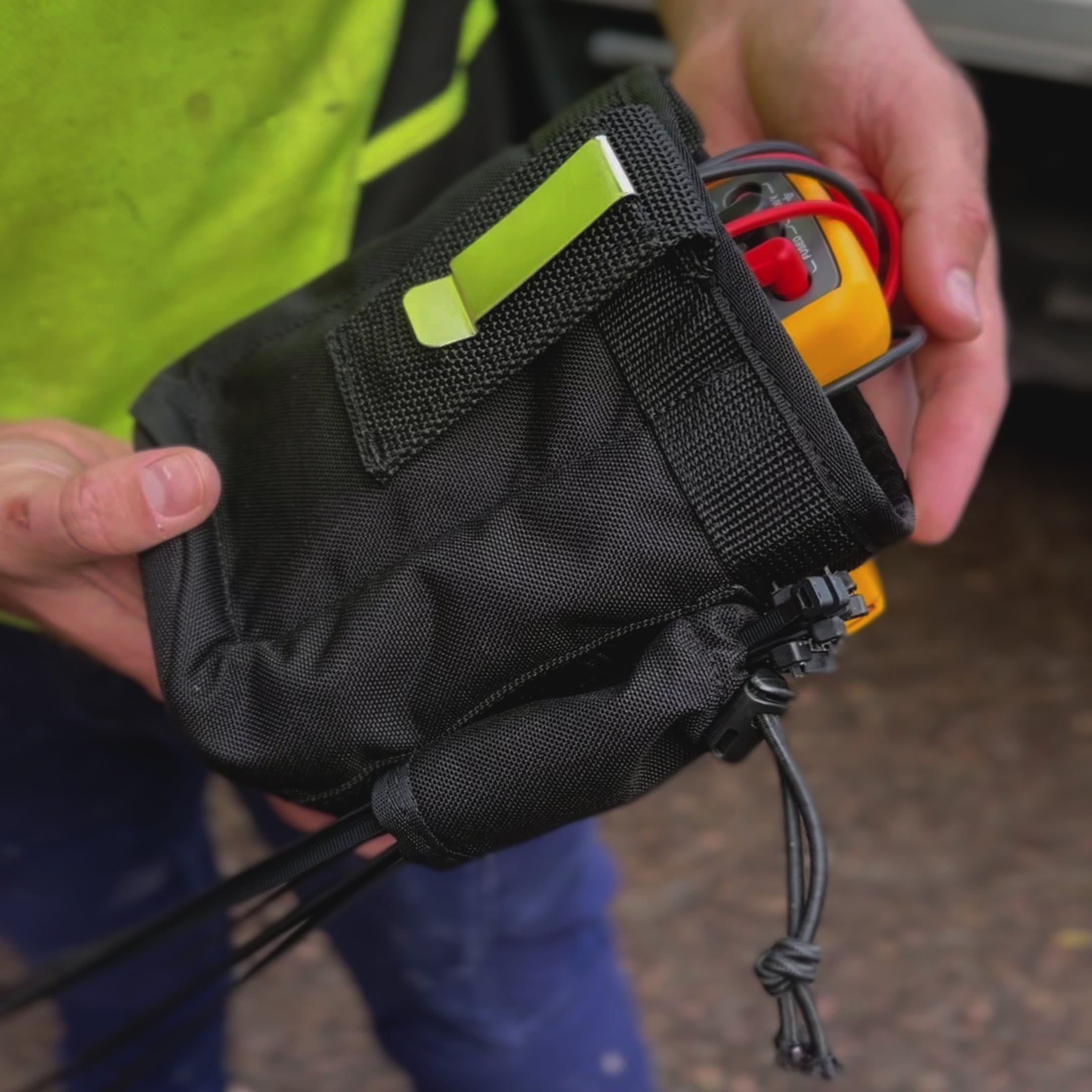 When worn on a tool belt, it works well as a non-dominant side pouch, giving the ability to keep common electrical fixings and clips organised and within reach (e.g. cable clips, cable ties, screws, GPOs, BP connectors etc.).